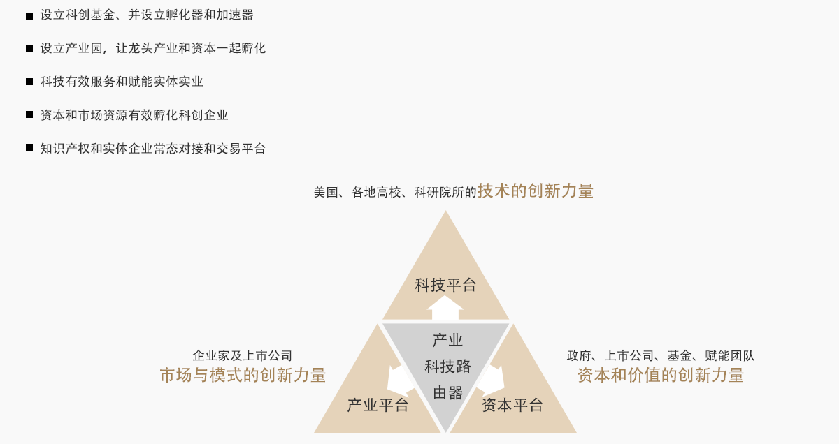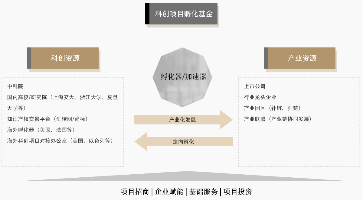 緊緊圍繞“資本主導、產(chǎn)業(yè)路由、異地孵化、離岸加速、本地整合”五大目標,通過產(chǎn)業(yè)引導基金投資的形式,整合行業(yè)資源,將有核心技術的高校院所和高校人才、有市場的企業(yè)和市場人才以及資金和資本有效結合,形成資本-科技-產(chǎn)業(yè)為一體的產(chǎn)業(yè)科技路由器,為地區(qū)政府打造資本創(chuàng)新總部群。